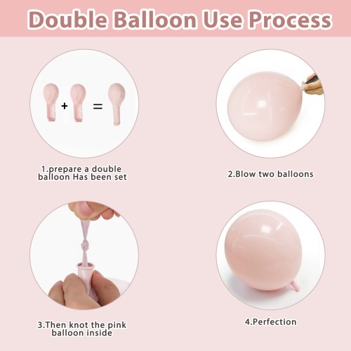 - 【Pink White Balloons】: This pink white nude balloon arch kit includes: 21pcs double stuffed pink balloons, 21pcs double stuffed light pink balloons, 20pcs double stuffed nude balloons, 21pcs double stuffed white balloons. 31pcs single layer pink, light pink and nude balloons, 1 roll of decorative strip and 5pcs balloon sticker.