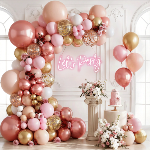 - 【Rose pink balloons】: This rose gold pink balloon arch kit including: 27pcs rose gold metallic balloons, 27pcs nude balloons, 25pcs pastel pink balloons, 25pcs gold metallic balloons, 15pcs matte white balloons , 5pcs gold confetti balloons and 5pcs rose gold confetti balloons. The Balloon Garland Accessories Kit including: 1pcs strip tape, 5pcs balloons stickers