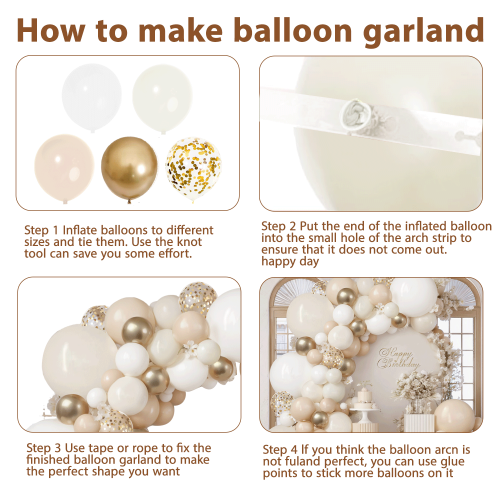 - 【Please Note】 : Please avoid exposing the white and gold balloon arch kit to high temperatures, sharp objects, or excessive friction to prevent bursting. If the neutral boho balloons kit don't meet your needs or have other questions, please contact us immediately, we will solve it for you right away.