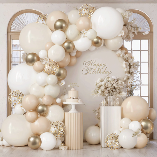- 【Sand White Gold Balloon Set】: The boho balloons kit includes 134 high-quality balloons: 37pcs 18/12/10/5 inch sand white balloons,37pcs 18/12/10/5 inch white balloons,30pcs 12/10/5 inch light smoke white balloons,20pcs 12/5 inch chrome gold balloons,10pcs 12inch gold confetti balloons,1 roll of decorative strip and 5pcs balloon sticker.