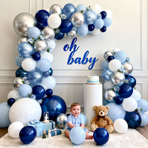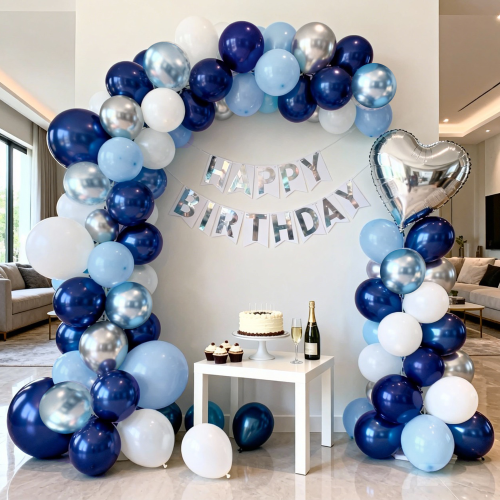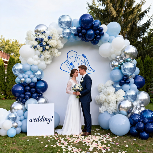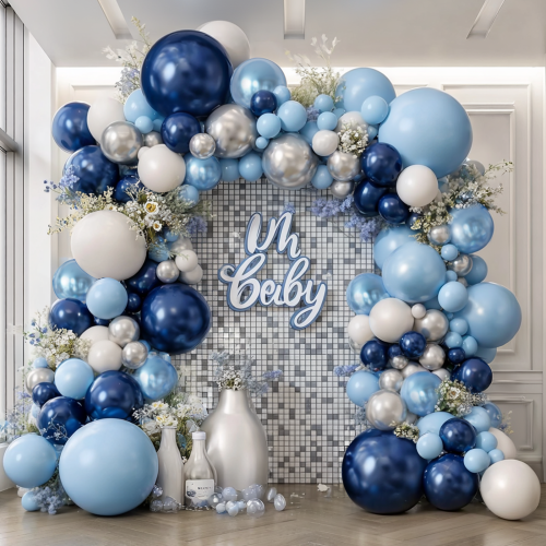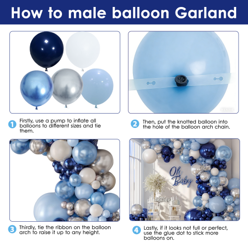 - Easy to Assemble: We offer balloon sticker and decorative strips to help you create a navy blue white silver balloon garland more easily. First, inflate balloons of different sizes, thread them through the holes in the chain, then glue 5-inch balloons onto the arch, finally creating the balloon arch shape you desire.