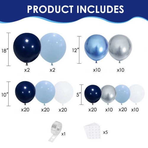 - Blue White Silver Balloon Set: The blue white silver balloon garland kit includes 144 pcs latex balloons:52 pcs 18/12/10/5 inch pearl navy blue balloons,42 pcs 18/10/5 inch light blue balloons,20 pcs 12/5 inch metallic silver balloons,40 pcs 10/5 inch matte white balloons,1 roll of decorative strip and 5pcs balloon sticker,easily assemble a blue white silver balloon arch.