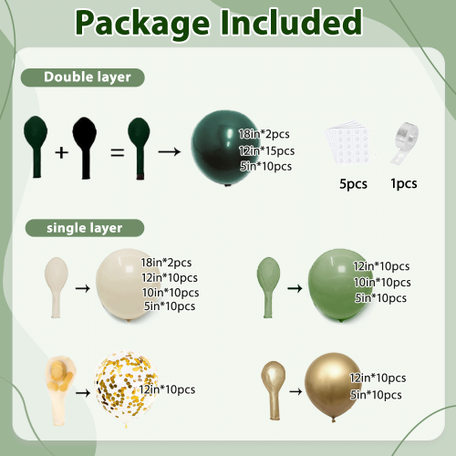 - 【Dark Green Balloons】: Green white gold balloon arch kit includes: 27pcs 18/12/2 inch double stuffed dark green balloons, 32pcs 18/12/10/5 inch white sand balloons,30pcs 12/10/5 inch sage green balloons,20pcs 12/5 inch chrome gold balloons,10pcs 12 inch gold confetti balloons,and 1 roll of decorative strip and 5pcs balloon sticker can easily create a green balloon garland or arch with rich layers and full visual effects.